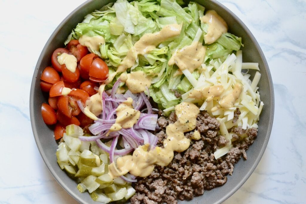 If you’ve been reading my blog for a while, you know that I really love a good salad. It’s not a requirement of being a dietitian; it’s been a lifelong habit. I’m always looking for new salads to use up what I already have on hand and this Cheeseburger Salad is so good!