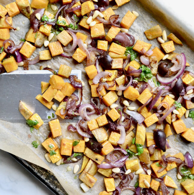 Roasted sweet potatoes with caramelized onions and cilantro dressing